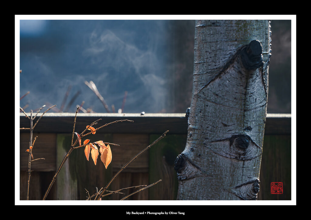 氣溫突然變暖,陽光下後院現氤氳奇觀。今日上午攝於我家後院,並賦七絕一首: